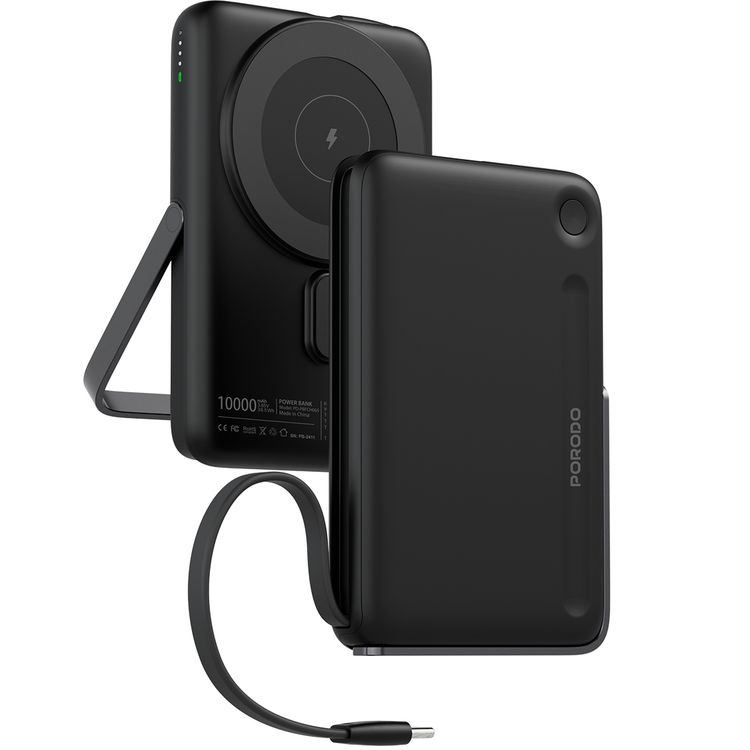 Porodo 10000mAh Power Bank with Built-in Type-C Cable & Stand, Strong Magnetic Hold, 20W Power Delivery, Fast Charging Support, 15W Wireless Output - Black