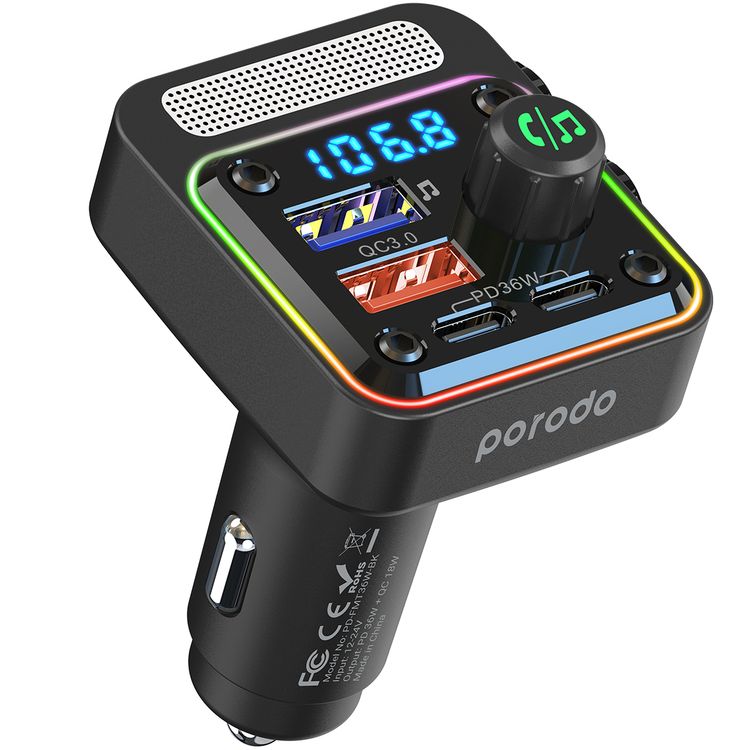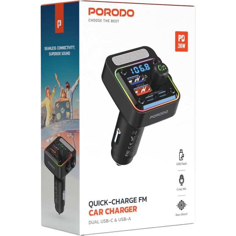 Porodo 3-in-1 FM Car Charger with 36W Power Delivery, 10m Bluetooth Range, Built-in Microphone, Multi-Port Charging, Up to 32 GB USB Flash Drive - Black
