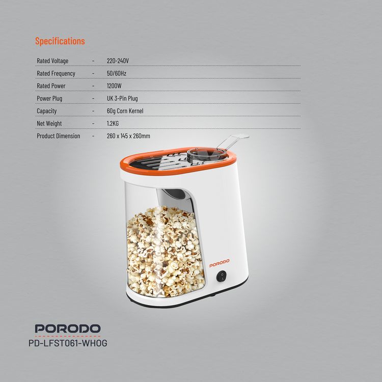 Porodo Lifestyle Air-Popped Popcorn Maker, Quick and Efficient, 60g Corn Kernel, 2-4 Minutes Prep Time, Oil-Free - White / Orange