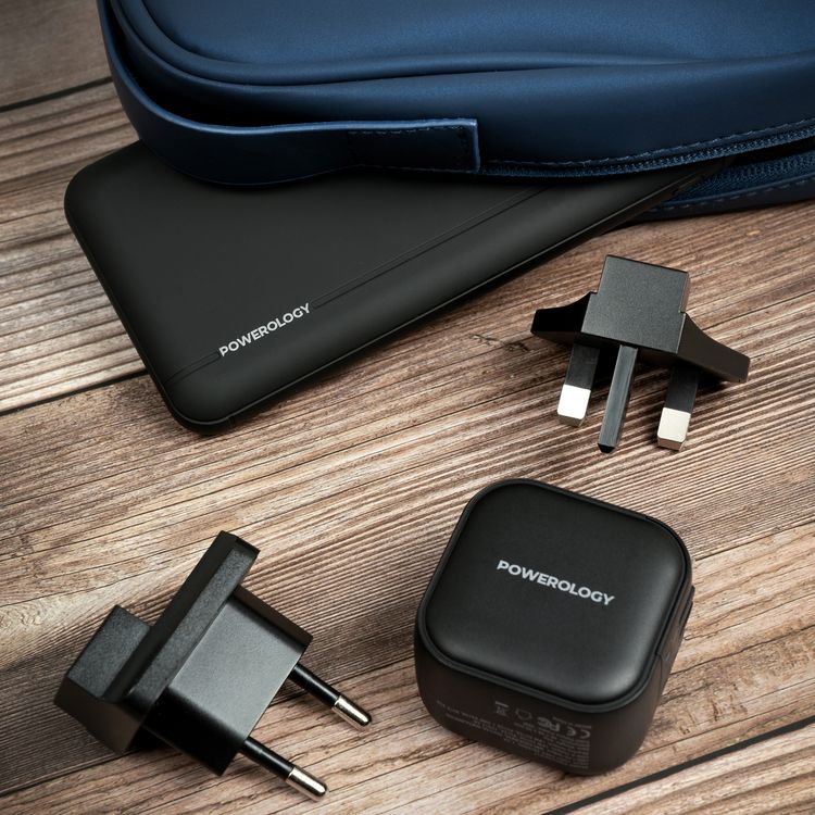 Powerology 5-in-1 Universal Power Combo with Power Bank, Universal Travel Charger & Fast-Charging Cables, 10000mAh PD Power Bank, 38W Charger, Carry Bag Included- Black