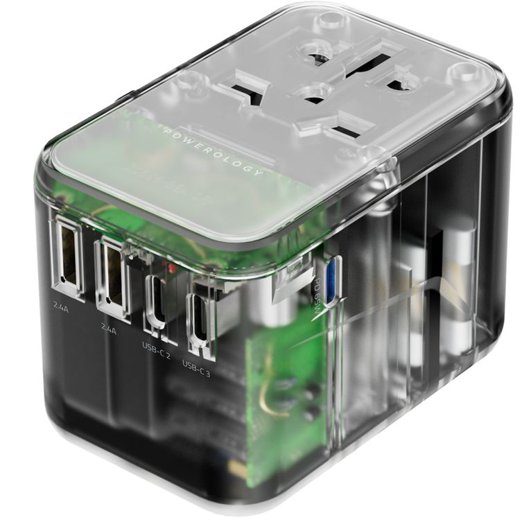 Powerology 65W PD Universal Multi-Port Travel Adapter with Triple USB-C Outputs, Universal Plugs, Combined Output Mode, Lightweight & Portable, Travel Friendly - Transparent