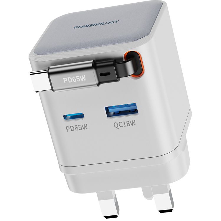 Powerology Dual Port Retractable GaN Charger, Built-in Safeguards, 3-Device Charging, 65W Power Delivery, Fire Proof Material, Patented Design, 75cm Retractable Type-C Cable - White