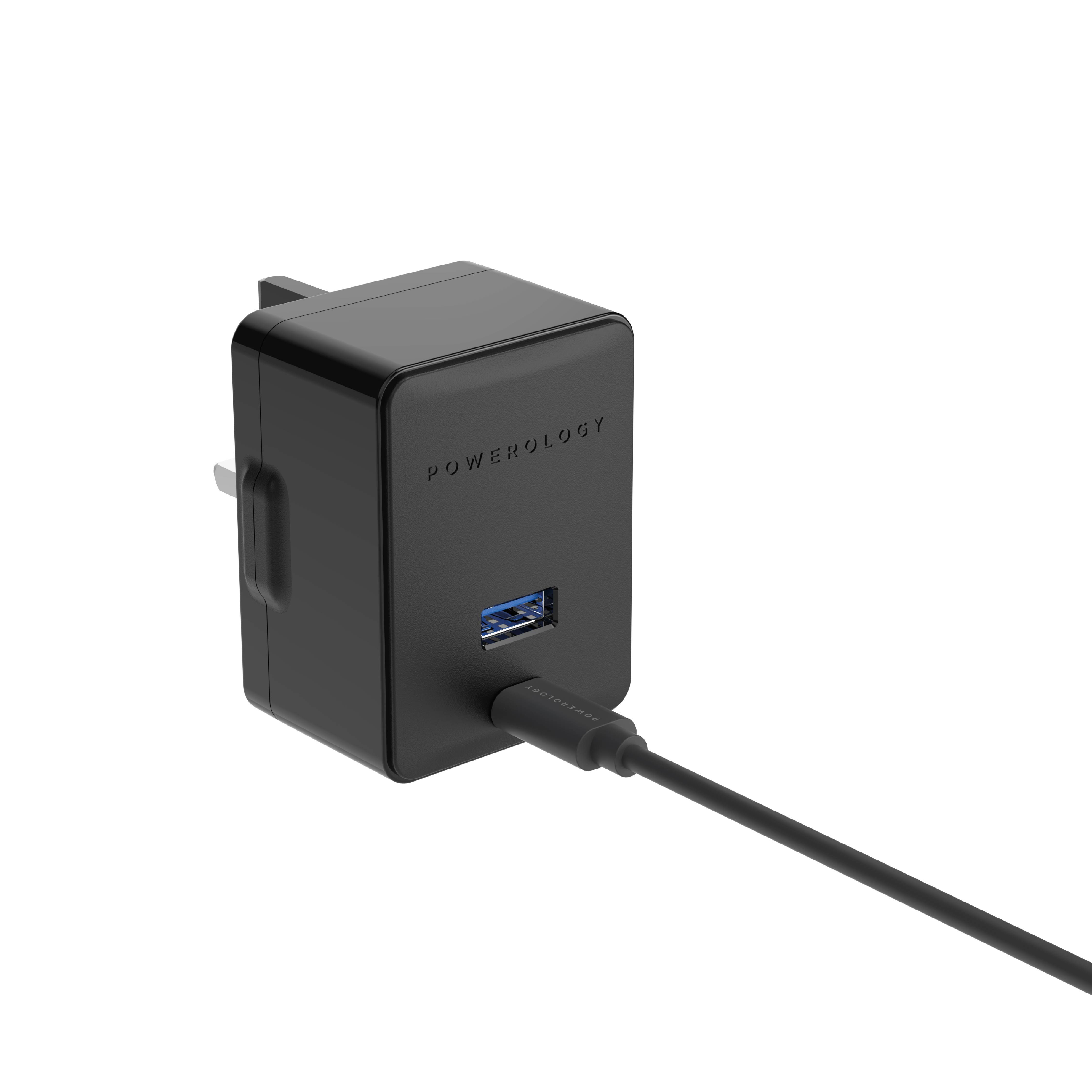Powerology Ultra-Quick Power Delivery & Quick Charge Wall Charger is a fast-charging product with 36 power delivery. Both ports are able to be used for charging devices simultaneously. AC Input: 100-240V Fast Charge PD Output: 18W 5V/2.4A 9V/2A 12V/1.5A USB Output: 18W 5V/2.4A 9V/2A 12V/1.5A.