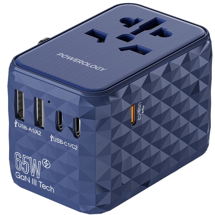 Powerology 65W PD Universal Multi-Port Travel Adapter with Triple USB-C Outputs, Universal Plugs, Combined Output Mode, Lightweight & Portable, Travel Friendly - Blue