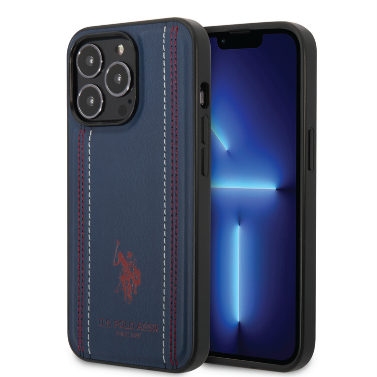 USPA PU Leather Case with Stitched Lines Double Line & Horse Logo iPhone 14 Pro Max Compatibility - Navy