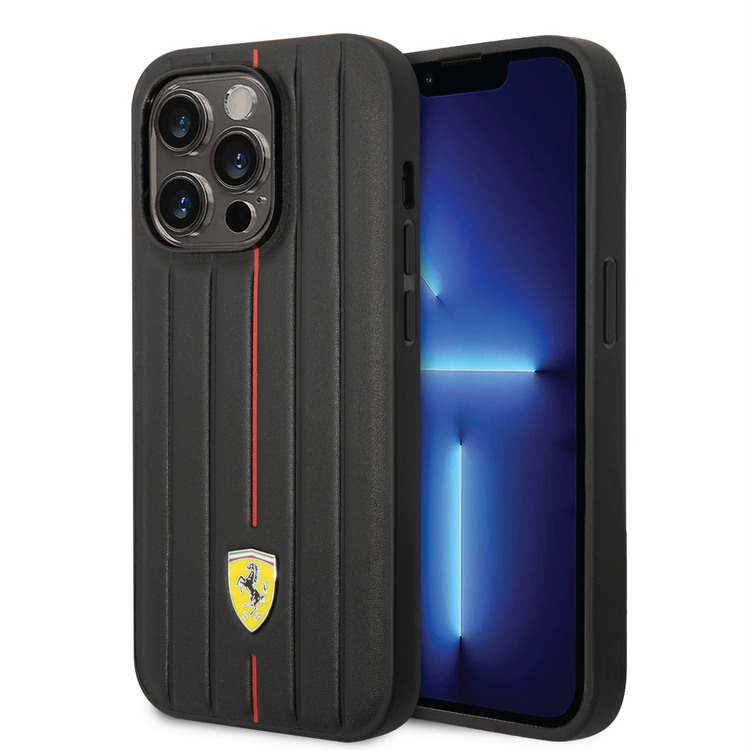 Ferrari Leather Case With Embossed Stripes & Yellow Shield Logo - iPhone 14 Pro Max - Black