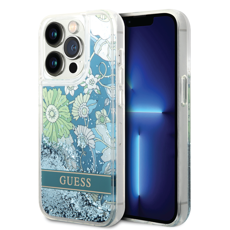 Guess Liquid Glitter Case with Flower Pattern Extra Shine Smooth Touch Feel iPhone 14 Pro Max Compatibility - Green