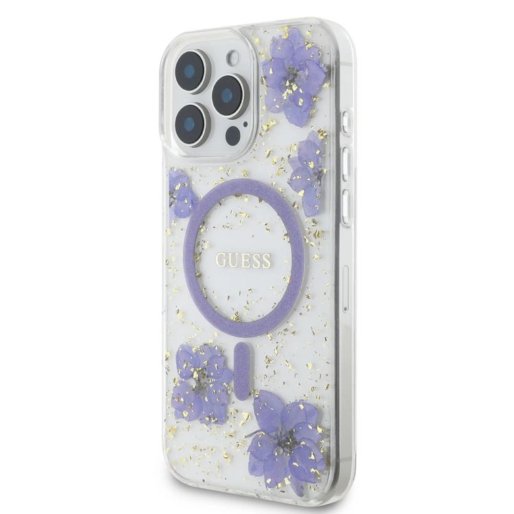 Guess MagSafe Hard Case with Resin Flowers Design for iPhone 16 Pro, Drop protection, Comfortable Grip - Purple