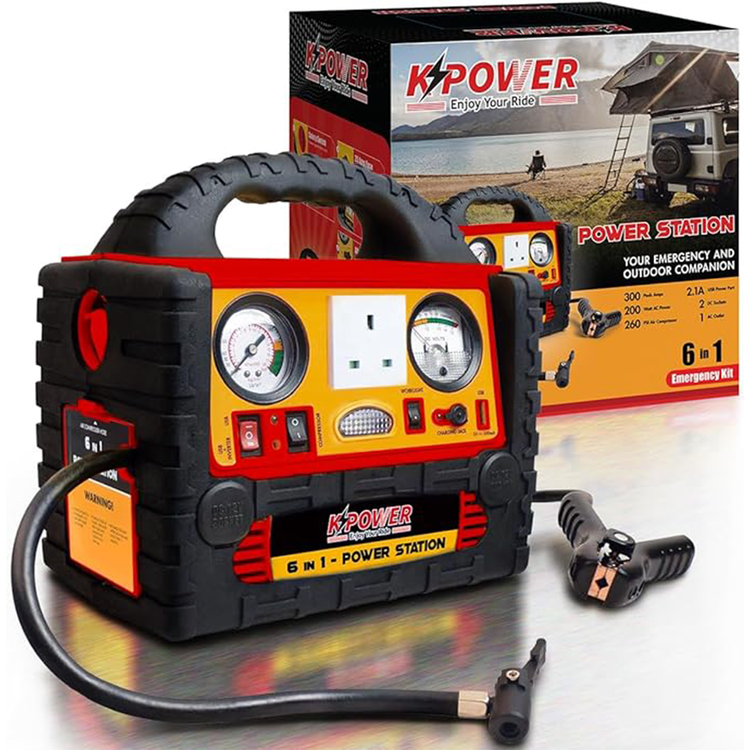 K POWER Portable Power Generator & Car Jump Starter, 1400 Peak Amp, 48000mAh, 200W, 220V, 260PSI Air Compressor, LED Light, High Power Safety