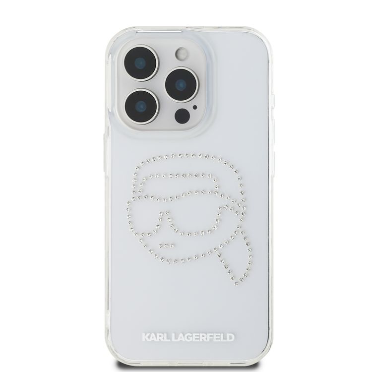 Karl Lagerfeld IML Hard Case for iPhone 16 Pro with Rhinestones Karl Head Logo, Slim Profile, Lightweight, Easy Snap-on, Drop Protection, Sustainable Packing - Transparent