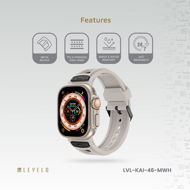 Levelo Kai Watch Strap, Apple Watch SE 9/8/7/6/5 (46/49mm), TPU + Metal Buckle, Hypoallergenic, 24/7 Wearability - Moonlight White