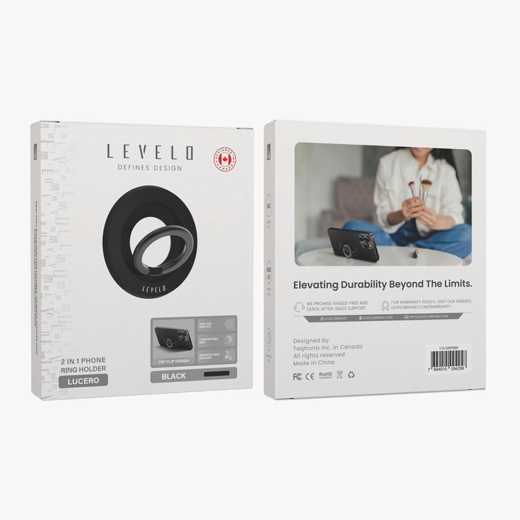 Levelo Lucero 2-in-1 Phone Ring Holder with N52 Magnets, Non-Slip Surface, 135° Flip Design, Comfortable Grip, 4000GS Magnetic Force - Black