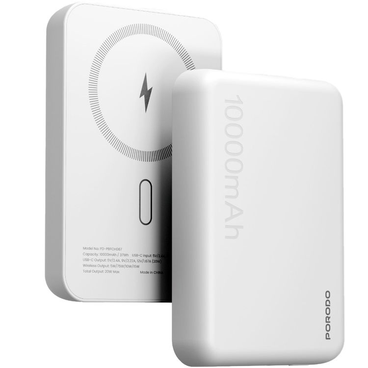 Porodo 10000mAh MagSafe Power Bank, Fast Charge, Portable & Compact Design, Type-C Input, Type-C & Wireless Outputs, 10° C-45° C Working Temperature, Strong Magnetic Hold, 20W Power Delivery - White