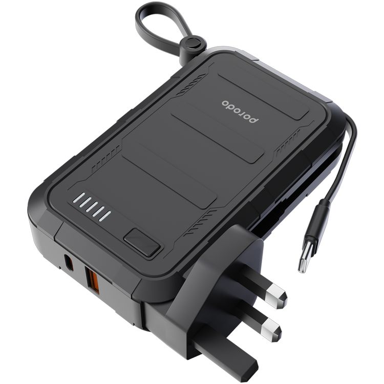 Porodo 10000mAh PPS Wall Charger Power Bank with Integrated Type-C & Lightning Cable, PD 20W, 22.5W USB-A Output, 10W Lightning, Simultaneous Charging - Black