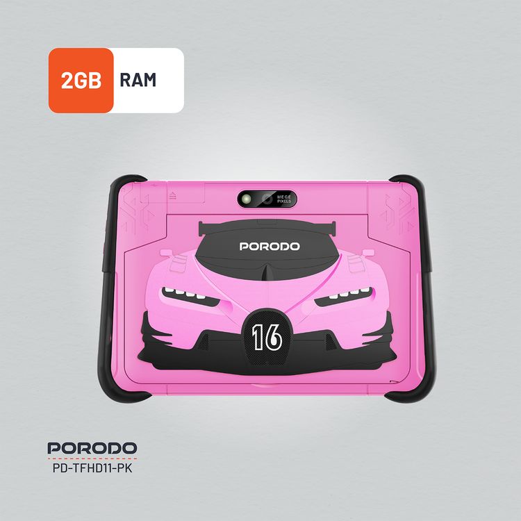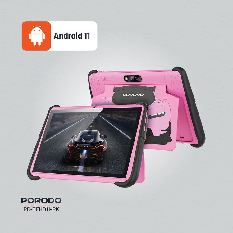 Porodo 10.1" Kids Android Tablet with 4000 mAh Battery Capacity, 64GB Storage, 2GB RAM, Type-C Charging Port, Audio Jack, Bluetooth V4.2, 2 Nano Sim Cards, Android 11 - Pink