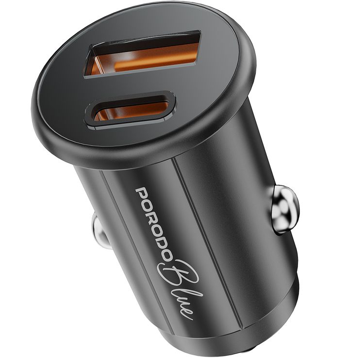 Porodo Blue Dual Port 30W Car Charger with Type-C to Lightning Cable, USB-C & USB-A Ports, 15W Shared Output, Polycarbonate Material - Black
