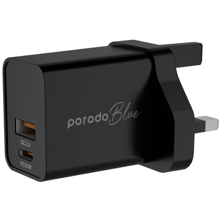 Porodo Blue Dual Port Wall Charger PD/QC - Black