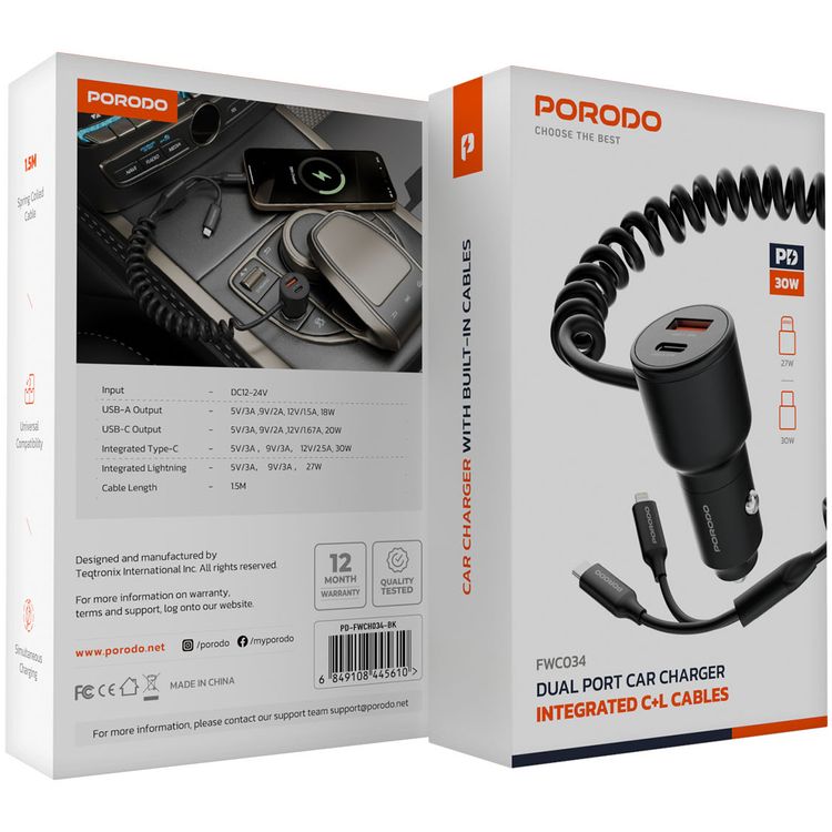 Porodo Dual Port Car Charger with Integrated C+L Cables, Adaptable, Simultaneous Charging, Universal Compatibility, 1.5m Cable Length - Black
