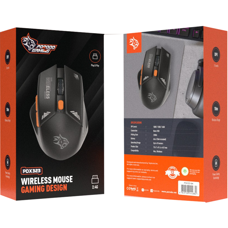 Porodo Gaming Wireless Mouse, 3 Levels DPI, 10m Wireless Range, Power Saving Technology, Mac & Windows Compatible - Black