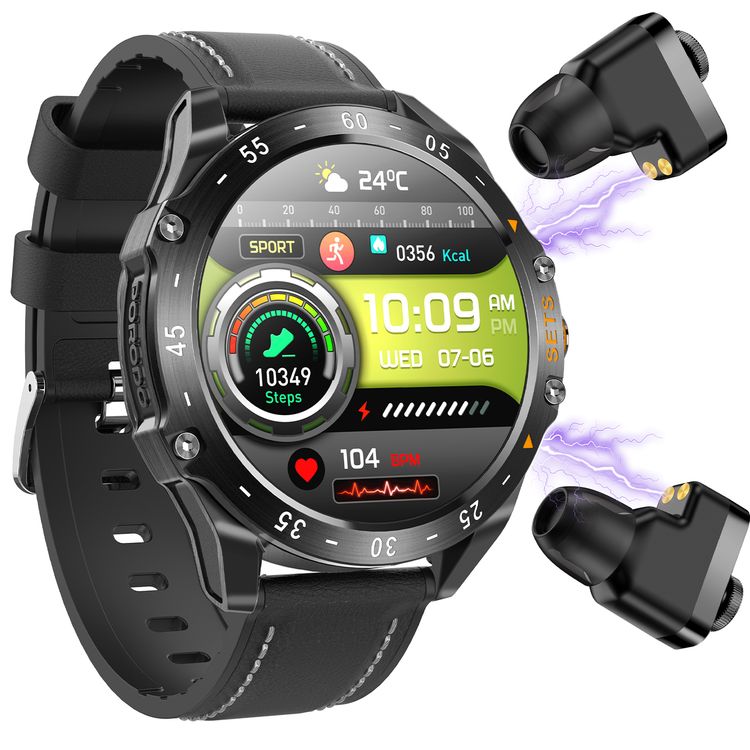 Porodo Hype Smart Watch with Wireless Earbuds and Black Leather Band, Compatible with Android 5.0, iOS 10.0 and Above