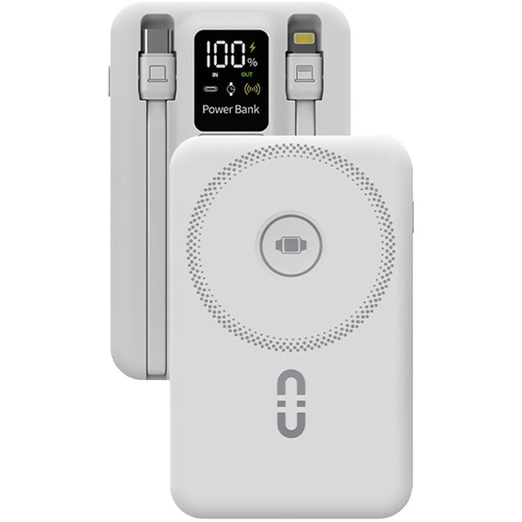Porodo Magnetic Wireless Power Bank with Built-in USB-C + Lightning Cable Bracket, Simultaneous Charging, Digital Display, PD 22.5W - White