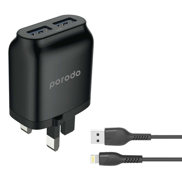 Porodo Main Charger, Dual USB Wall Charger 2.4A with Improved Version PVC Lightning Cable, Fast Charging, Over-heat Protection 1.2m Black - UK