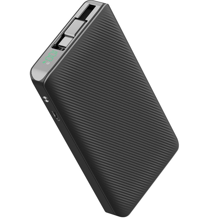 Powerology 10000mAh Retractable Cable Power Bank with LED Display, Lightweight & Portable Design, Fast-Charging, USB-C Input & Output, 2-Device Charging, Patented Design, 22W Power Delivery - Black