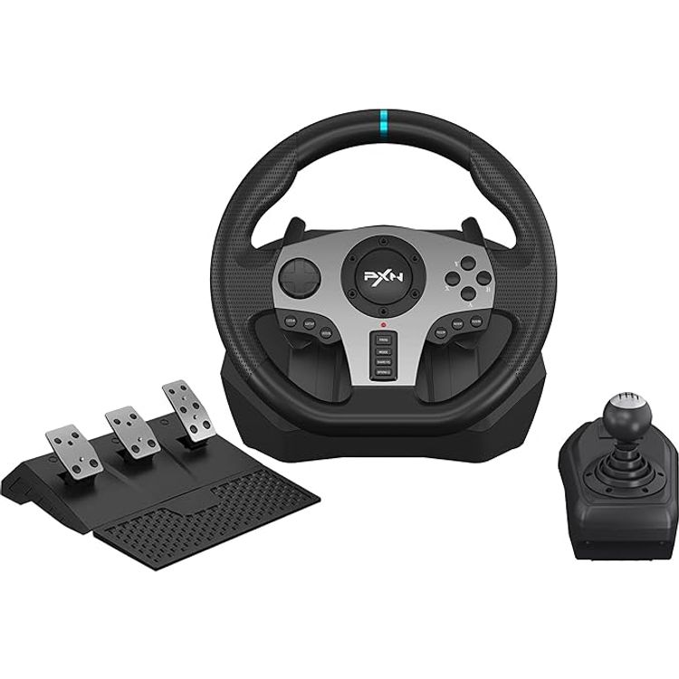 - 5. 【High-end Racing Simulator】: PXN V9 racing steering wheel provides a rotation angle switch: The dial switch can switch from 270 degrees to 900 degrees steering. PXN-V9 Game Steering Pans Designed for professional racing games, full-size drive wheels with pedal and shift lever: responsive foot pedals, acceleration, braking and shift, with real car feel. The six-speed manual gearbox uses the "H" gearbox for rapid and smooth variable speed.
