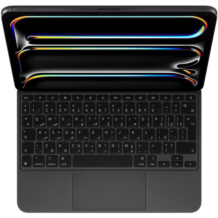 لوحة مفاتيح آبل ماجيك لجهاز آيباد برو 13" M4 مع اللغة العربية، حماية أمامية وخلفية، مفاتيح مضاءة وآلية مقص، منفذ USB-C، صف مفاتيح وظائف يتكون من 14 مفتاح للوصول السريع، تصميم محمول ورفيع، إيماءات متعددة اللمس - أسود