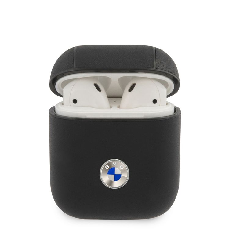 CG Mobile مجموعة BMW Signature غلاف PC جلد طبيعي مع شعار معدني فضي، عالي الجودة، لأجهزة Airpods 1/2، مرخص رسميًا - أسود