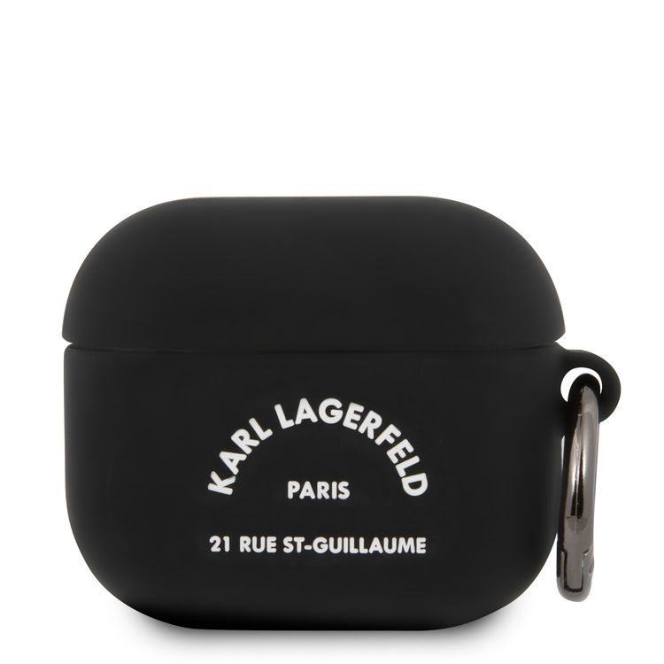 جراب شعار سي جي موبايل من كارل لاغرفيلد أسود RSG مع حلقة متوافقة مع ابل ايربودز 3 ، مقاوم للخدش والسقوط ، غطاء سيليكون واقٍ مع حامل مضاد للضياع لـ ابل ايربودز 3 مرخص رسميًا
