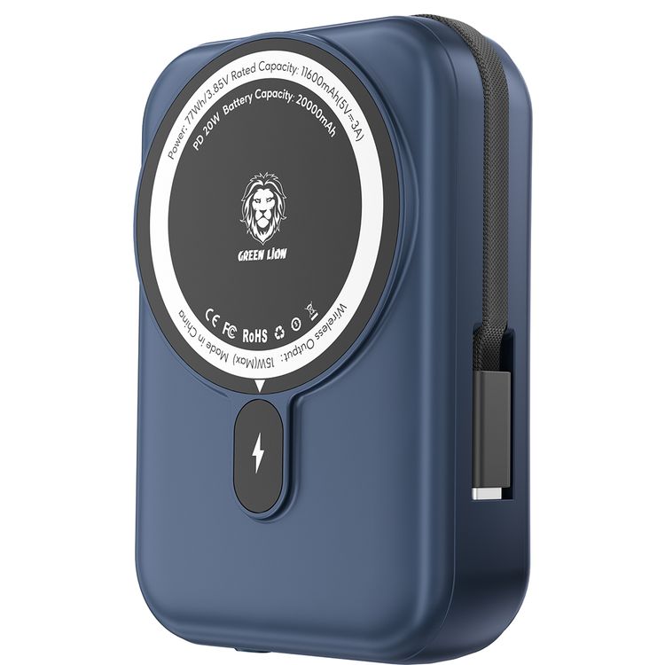 بنك الطاقة جرين ليون 20000mAh موناكو MagSafe مع كابل Type-C مدمج، شاشة LCD، توصيل طاقة 20W، جذب مغناطيسي، تصميم مدمج - أزرق داكن