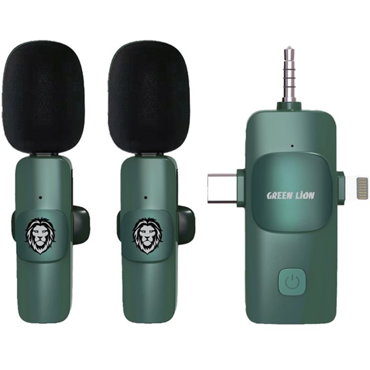 ميكروفون Green Lion 3 في 1، نوع C، Lightning، اتصال AUX ولاسلكي، التوصيل والتشغيل، عمر البطارية 3-4 ساعات، ميكروفون رقمي من السيليكون - أخضر