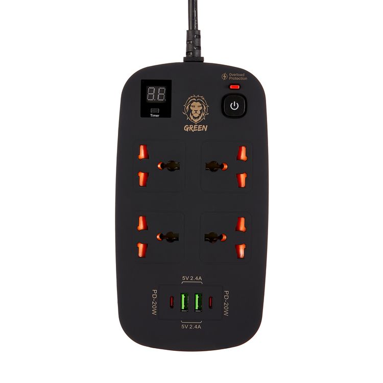 مقبس طاقة ذكي متعدد المنافذ من Green Lion، 4 مقابس تيار متردد، 2 منافذ USB-A و2 USB-C، وظيفة مؤقت من 1 إلى 24 ساعة، الجهد الزائد، التيار الزائد وحماية الحرارة الزائدة، حماية من زيادة الطاقة - أسود