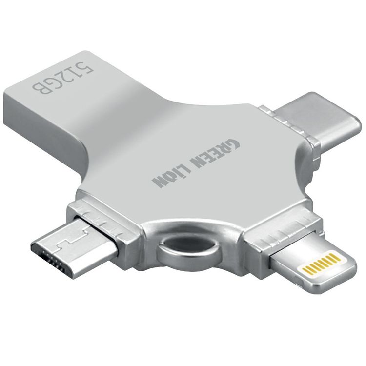 محرك أقراص فلاش USB 4 في 1 من Green Lion بسعة 512 جيجابايت، وموصلات USB-A وUSB-C وmicro USB وLightning - فضي