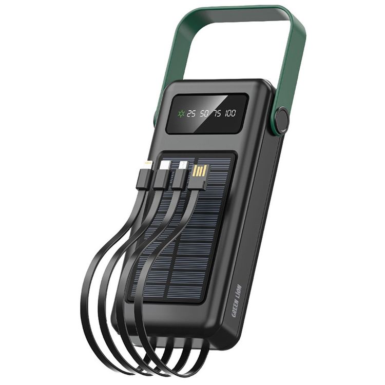 باور بانك Green Lion Solar Max بسعة 30000 مللي أمبير في الساعة مع شاشة رقمية ولوحة شحن تعمل بالطاقة الشمسية ومخرج Type-C/Micro/Lightening/USB-A وخفيف الوزن وقابل للحمل و4 كابلات مدمجة - أسود