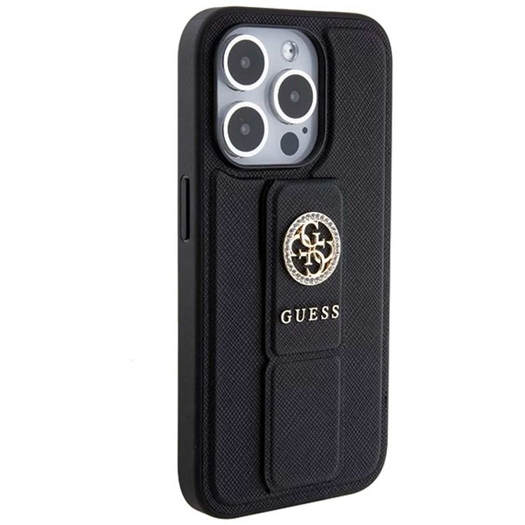 حقيبة Guess Gripstand Saffiano مع شعار 4G Strass Metal - أسود - iPhone 15 Pro Max