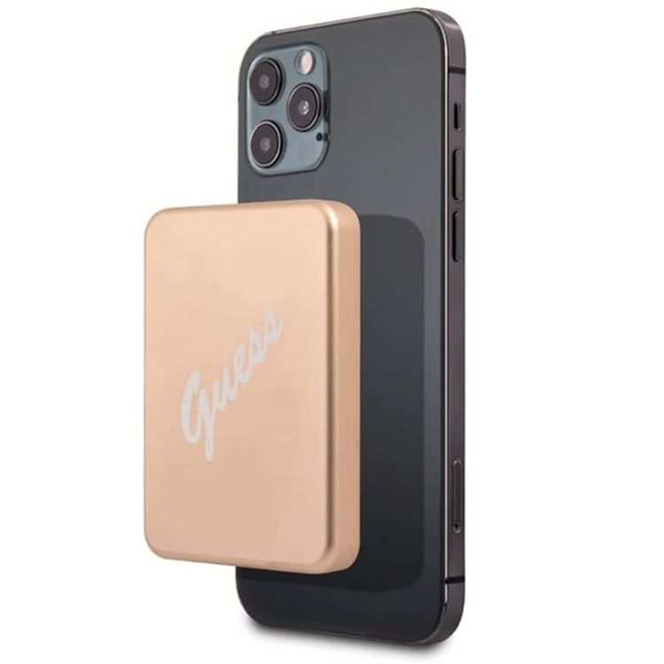 تخمين باور بانك ماق سيف بسعة بطارية 3000 مللي أمبير، خرج لاسلكي 5 واط، دعم الشحن السريع، خفيف الوزن ومحمول - بلون ذهبي لامع.