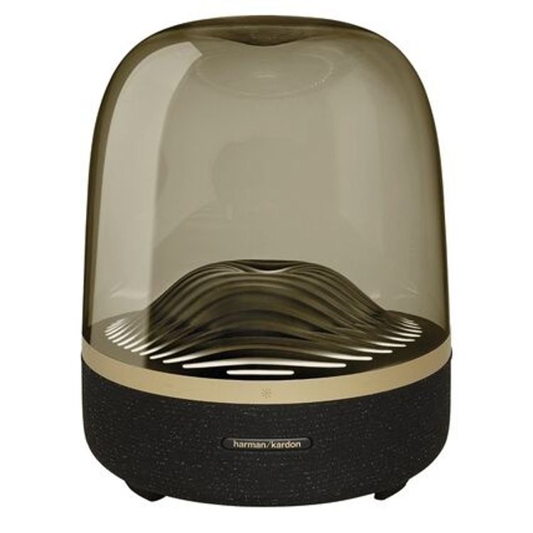 Harman Kardon Aura Studio 3 مكبر صوت ستيريو لاسلكي بتقنية البلوتوث مع تأثير إضاءة تموج أنيق وصوت استثنائي بزاوية 360 درجة، أيقوني في أي مكان - أسود/ذهبي.