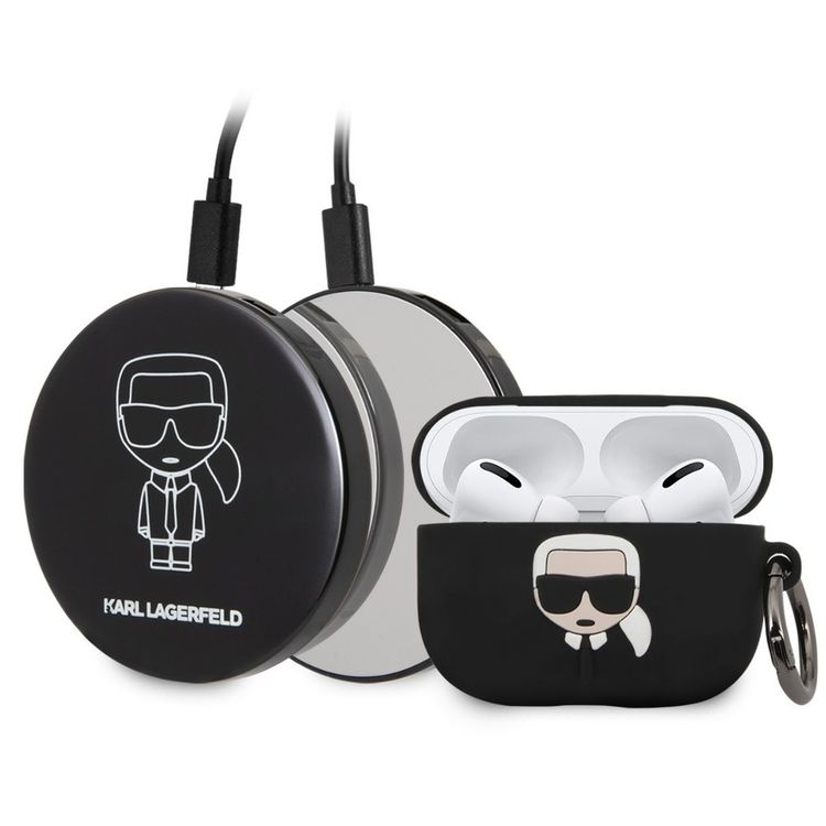 كارل لاغرفيلد حافظة سيليكون إيربودز برو من Bundle Ikonik ، سيليكون عالي الجودة ، يناسب تمامًا + باور بانك بمرآة 2000 مللي أمبير ، بطارية ليثيوم بوليمر - أسود