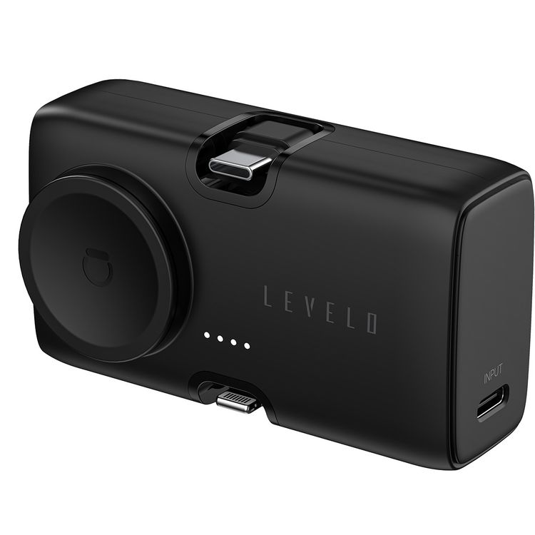 باور بانك محمول من Levelo Nova Mini بسعة 5000 مللي أمبير في الساعة، 20 وات PD، منافذ Type-C وLightning قابل للدوران، ومخرجات لاسلكية وiWatch، وحامل مدمج، ومؤشر بطارية LED - أسود