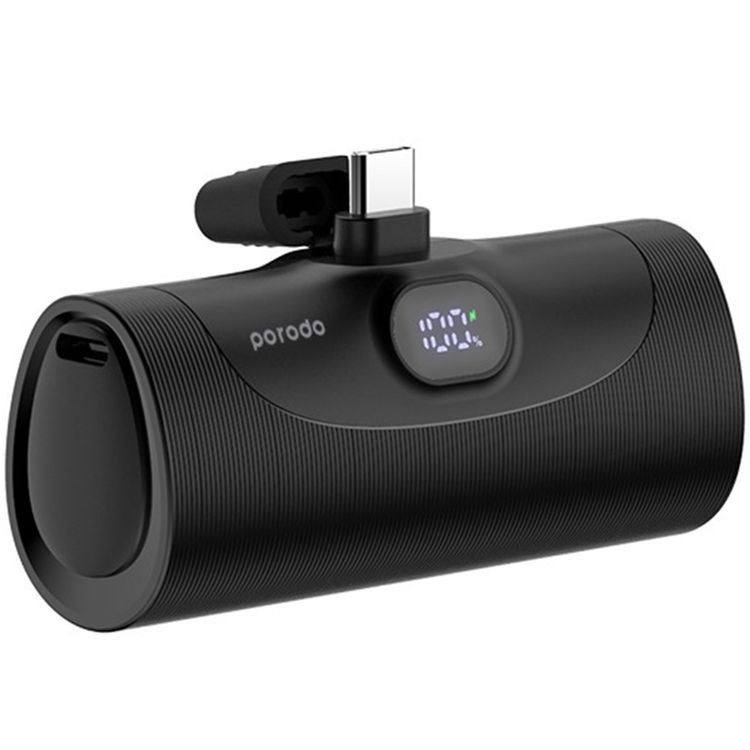 محطة باور بانك 4 في 1 من بورودو بسعة 5000 مللي أمبير في الساعة مع موصلات Lightning وType-C مدمجة، 20 وات PD، محمولة، حامل مدمج، شاشة رقمية LED - أسود