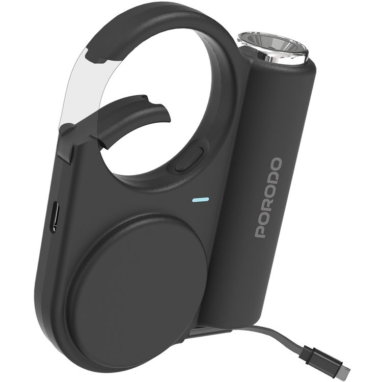 بنك طاقة خارجي بورودو 5000 مللي أمبير في الساعة مع أوضاع إضاءة فلاش SOS منخفضة وعالية ومتوسطة وطول كابل قابل للسحب من النوع C 70 سم وسطوع قابل للتعديل - أسود