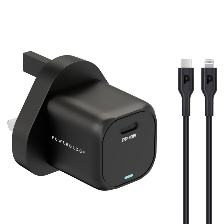 شاحن Powerology GaN PD بقدرة 33 وات مع كابل USB-C إلى USB-C بطول 1.2 متر/3.9 قدم - أسود
