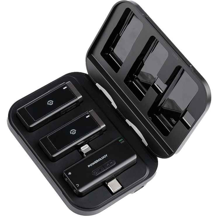 ميكروفون لافاليير لاسلكي مزدوج الموصل من Powerology MFI x2، 2000 مللي أمبير، مسافة نقل 120 مترًا، موصل Lightning وType-C، وقت عمل 12 ساعة - أسود