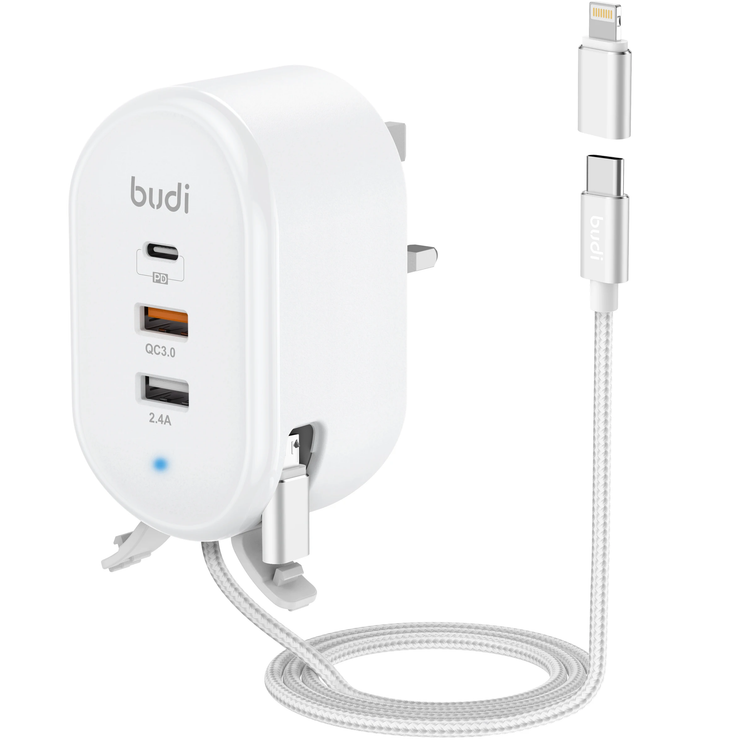 شاحن منزلي من بودي مع كابل يو أس بي-سي / مشترك كهربائي ميكرو& لايتنينغ - أبيض
