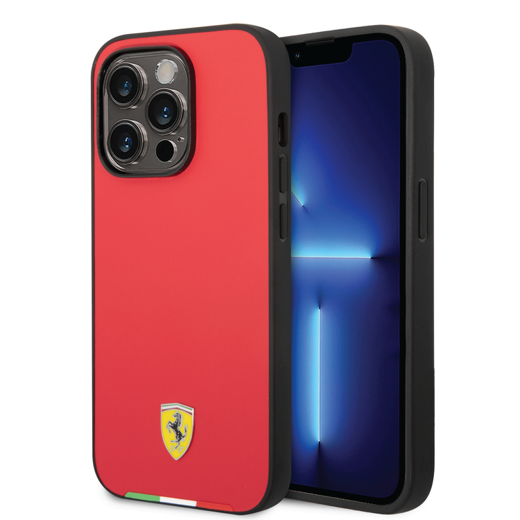 CG Ferrari Magsafe Compatibility Hard PU Smooth Case with Italian Flag Line & Metal Logo iPhone 14 Pro Max Compatibility - Red