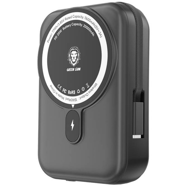 بطارية محمولة من جرين ليون بسعة 20000 مللي أمبير مع تقنية MagSafe من موناكو، تحتوي على كابل Type-C مدمج، شاشة LCD، قدرة شحن 20 واط، جذب مغناطيسي، تصميم مضغوط - باللون الأسود.