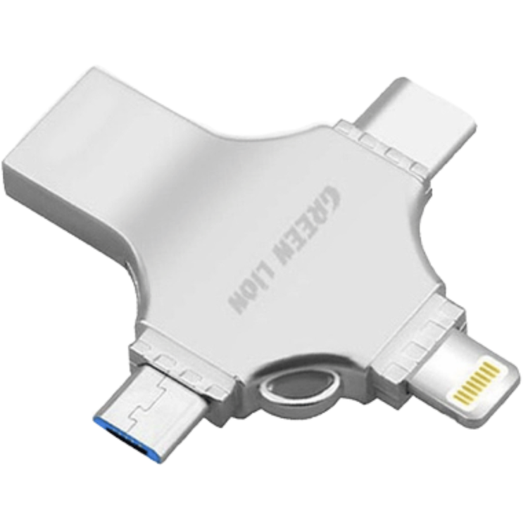 محرك أقراص فلاش USB 4 في 1 من Green Lion بسعة 256 جيجابايت، وموصلات USB-A وUSB-C وmicro USB وLightning - فضي