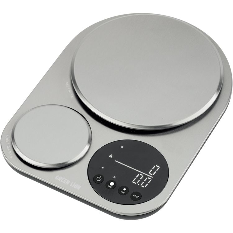 ميزان مطبخ ثنائي من غرين ليون مع مؤشر انخفاض البطارية، منصات كبيرة وصغيرة، مؤشر زيادة الوزن، عرض رقمي، وظيفة التاري، مصنوع من الفولاذ المقاوم للصدأ 201 - فضي